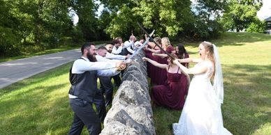 A little castle high jinks — swords raised, laughter ringing, and the bridal party declaring the start of a legendary love story.