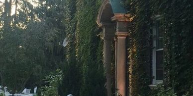 The rounded stone doorway, softened by cascading ivy, feels like an entrance to another century — timeless, intimate, and quietly magnificent.